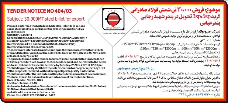 به گزارش پیام آوران معدن و فولاد: ارفع از علاقه مندان به شرکت در مزایده مذکور دعوت کرد که از تاریخ ۱۴۰۴/۰۸/۲۱ تا ۱۴۰۴/۰۹/۰۴ جهت دریافت اسناد مزایده به وب سایت شرکت آهن و فولاد ارفع و یا لینک زیر مراجعه کنند.