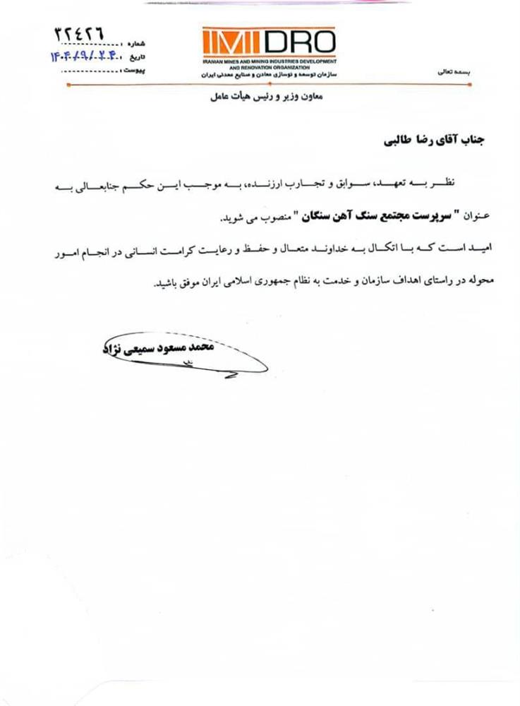 به گزارش پیام آوران معدن و فولاد: در حکم رئیس هیات عامل سازمان توسعه و نوسازی معادن و صنایع معدنی آمده است: نظر به تعهد، شایستگی و تجارب ارزشمند، رضا طالبی به موجب این حکم به عنوان سرپرست مجتمع سنگآهن سنگان منصوب میشود.