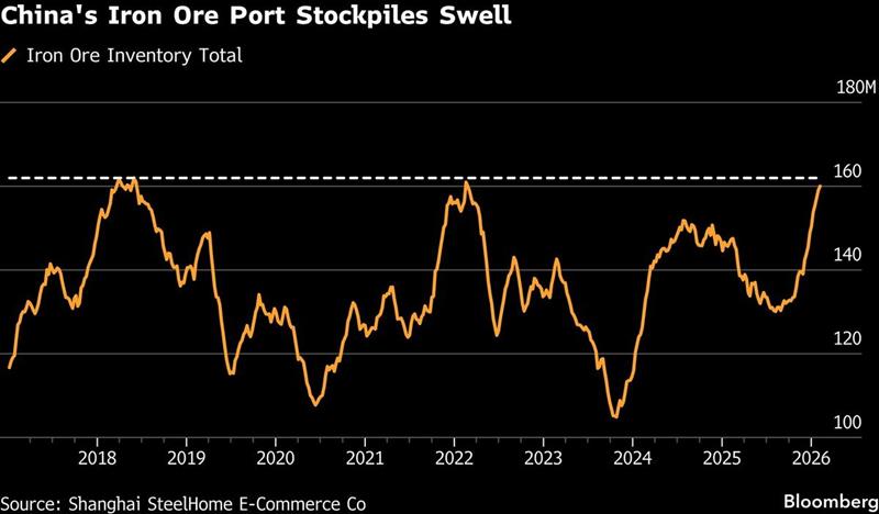 بر اساس دادههای جمعآوریشده توسط Shanghai SteelHome E-Commerce Co. موجودی سنگ آهن در بنادر چین برای دهمین هفته متوالی افزایش یافت و ۰.۶ درصد رشد کرده و به ۱۶۰ میلیون تن رسید. این رقم بالاترین سطح از سال ۲۰۲۲ و نزدیک رکورد ثبتشده در سال ۲۰۱۸ است. افزایش موجودیها همچنین ممکن است بازتاب اختلاف قیمت بین معدنکار BHP و خریدار دولتی چین، CMRG باشد.