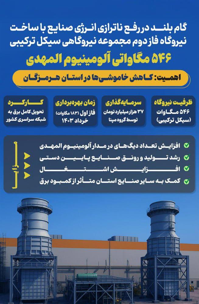 در جریان سفر استانی رئیس‌ جمهور به هرمزگان، واحد دوم گازی نیروگاه سیکل ترکیبی آلومینیوم المهدی با ظرفیت ۵۴۶ مگاوات و با اتکا به توانمندی‌ های گروه مپنا، به بهره‌ برداری رسید.