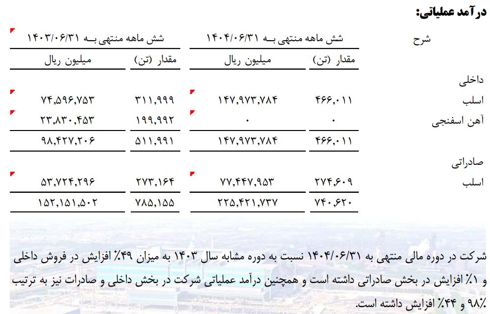 در قسمت فروش نیز به همین منوال پیش رفته و شرکت با وجود رکود داخلی و وضعیت متلاطم بازار جهانی توانسته ۷۴۰ هزار تن فروش ثبت کند که این عدد بالاتر از مدت مشابه سالهای ۱۴۰۳ و ۱۴۰۲ است. میزان ۴۶۶ هزار تن از اسلب تولیدی، در داخل فروش رفته که ۴۹ درصد فراتر از مدت مشابه سال قبل است. در بخش صادرات نیز ۲۷۴ هزار تن اسب صادر شده که عدد آن ۱۰۰۰ تن بیشتر از سال قبل بوده است. افت قیمت های جهانی، سرکوب نرخ ارز مبادله و کنترل قیمت پایه عرضه ها در بورس کالا منجر شده که میزان ریالی فروش به اندازه متناسب خود رشد نکند و برای شرکت عدم النفع ایجاد شود.