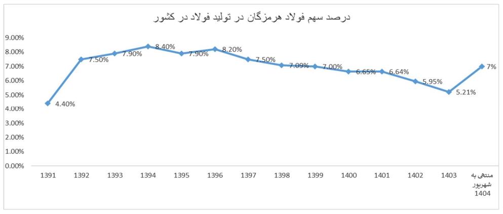 این شرکت در بخش تولید نیز جزو بزرگان طبقه بندی شده و ۷ درصد از فولاد کشور را پس از بزرگانی نظیر فولاد مبارکه، فولاد خوزستان، ذوب آهن و فولاد کاوه جنوب در رتبه ۵ کشور تولید میکند. سهم تولید هرمزگان در سال گذشته ۵.۲ بود و اکنون بالاتر از ۵ سال اخیر خود به عدد ۷ درصدی رسیده است.