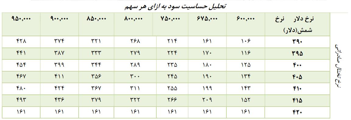 تحلیل حساسیت بر اساس نرخ های متنوع تختال صادراتی و دلار، نشان میدهد که فروش شرکت تا پایان امسال بر اساس تغییر هر یک از دو متغیر، به چه صورت خواهد بود. عدد منطقی با فرض دلار ۷۵۰۰۰ تومانی و تختال ۴۰۰ دلاری، عدد ۴۵ هزار میلیارد تومان است.