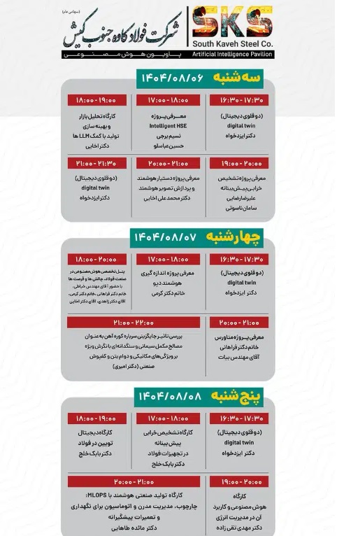 در جریان این رویداد، مجموعه‌ای از ارائه‌ های تخصصی در سه روز متوالی برگزار می‌شود که به معرفی غرفه هوش مصنوعی، پروژه‌ های مرتبط و کاربردهای این فناوری در صنعت فولاد اختصاص دارد. این برنامه‌ ها طبق جدول زمان‌بندی اعلام‌ شده،در محل پاویون اجرا خواهند شد.