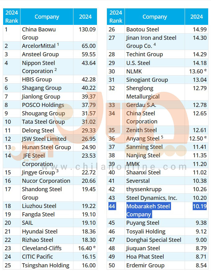 رتبه نخست این فهرست را گروه چینی بائو با تولید ۱۳۰میلیون و ۹۰هزار تن فولاد میانی در سال ۲۰۲۴ در اختیار دارد.