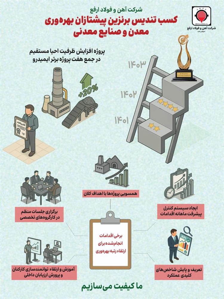 به گزارش پیام آوران معدن و فولاد: اهم دستاوردهای ارفع در مسیر بهره‌وری: