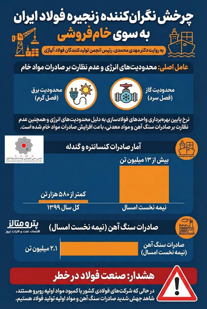 رئیس انجمن فولاد آلیاژی با ارائه آماری نگرانکننده اعلام کرد: «در حالی که کل صادرات کنسانتره و گندله در سال ۱۳۹۹ کمتر از ۵۸۰ هزار تن بود، این رقم تنها در نیمه نخست امسال به بیش از ۱۳ میلیون تن رسیده است.» همچنین در ۶ ماهه اول سال جاری، ۲.۱ میلیون تن سنگ آهن به خارج از کشور صادر شده است.