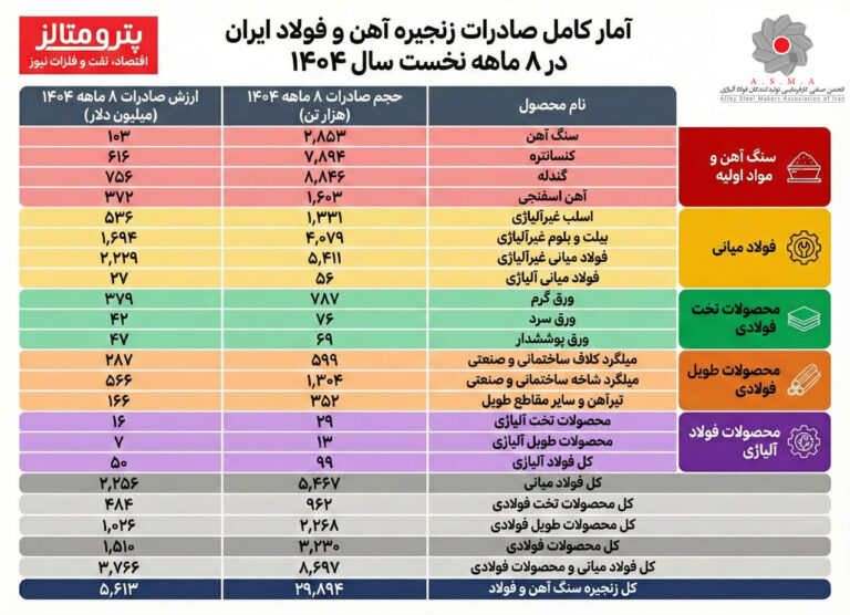 در جمع‌بندی کلی، صادرات کل فولاد آلیاژی کشور در این دوره هشت ماهه، ۹۹ هزار تن با ارزشی حدود ۵۰ میلیون دلار بوده است. همچنین مجموع صادرات کل محصولات فولادی، شامل تخت و طویل، به ۳ میلیون و ۲۳۰ هزار تن و ارزش یک میلیارد و ۵۱۰ میلیون دلار رسید. وقتی فولاد میانی و محصولات فولادی در کنار هم قرار می‌گیرند، حجم صادرات به ۸ میلیون و ۶۹۷ هزار تن و ارزش آن به ۳ میلیارد و ۷۶۶ میلیون دلار می‌رسد؛ رقمی که نشان می‌دهد بخش عمده ارزآوری زنجیره آهن و فولاد از حلقه‌های میانی و نهایی حاصل شده است.