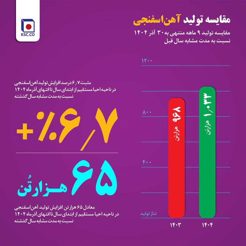 بنا بر این گزارش، در ناحیه احیا مستقیم فولاد خراسان تولید آهن اسفنجی را از ۹۶۸ هزار تن در ۹ ماهه پارسال به ۱میلیون و ۳۳ هزار تن در سال جاری رساند؛ افزایشی در حدود ۶۵ هزار تن که رشد نزدیک به ۶.۷ درصد را نشان می‌دهد و نقش کلیدی این ناحیه را در پایداری جریان تولید فولاد برجسته می‌کند.