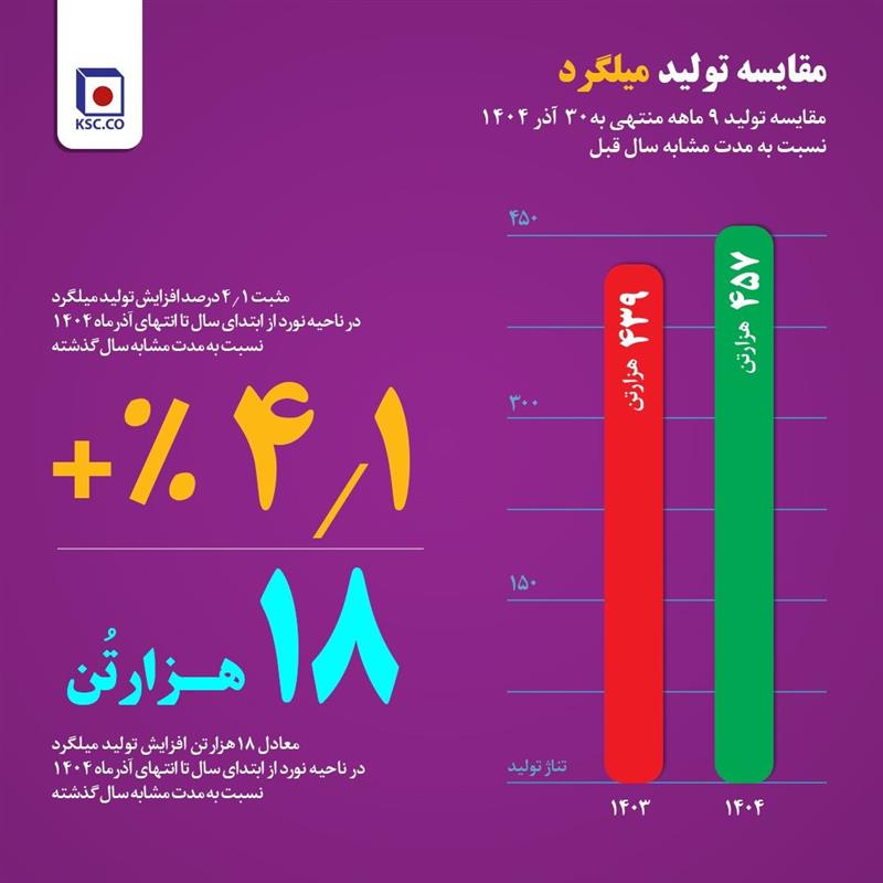 در ناحیه نورد نیز تولید محصولات نهایی از ۴۳۹ هزار تن در ۹ ماهه سال گذشته به ۴۵۷ هزار تن در سال جاری افزایش یافته است؛ رشدی معادل ۱۸ هزار تن که نشان‌دهنده افزایش حدود ۴.۱ درصدی تولید در انتهای زنجیره است.