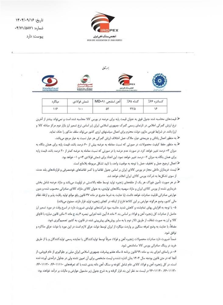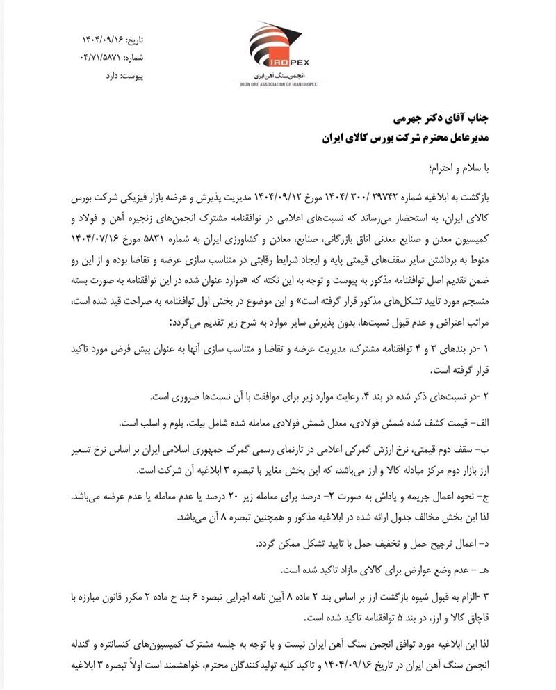 رئیس انجمن سنگ آهن ایران در ادامه از اقدامات اخیر انجمنها درباره بورس کالا خبر داد: «نامهای مشترک از سوی انجمن سنگ آهن برای بورس کالا پیرو توافق سه انجمن ارسال شد و از سایر انجمنها نیز درخواست شد مشابه این نامه را ارسال کنند و به توافق کلیه ذینفعان زنجیره فولاد تمکین نمایند.»