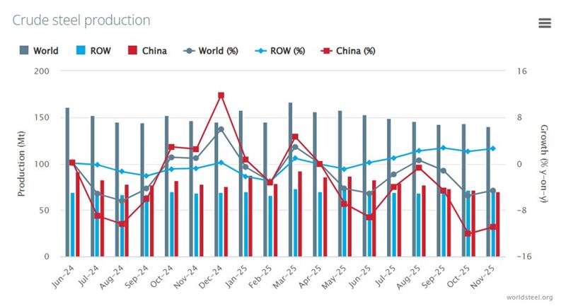 در سطح جهانی، چین همچنان بازیگر تعیینکننده بازار فولاد باقی مانده، اما تولید این کشور در ۱۱ ماهه ۲۰۲۵ با افت ۳.۹ درصدی نسبت به سال گذشته، به ۸۱۷.۹ میلیون تن رسیده است. این کاهش نشاندهنده تداوم سیاستهای انقباضی چین در بخش املاک و تلاش برای کنترل مازاد ظرفیت و انتشار کربن است؛ سیاستهایی که اثر آنها بهطور مستقیم در بازار جهانی فولاد منعکس میشود.