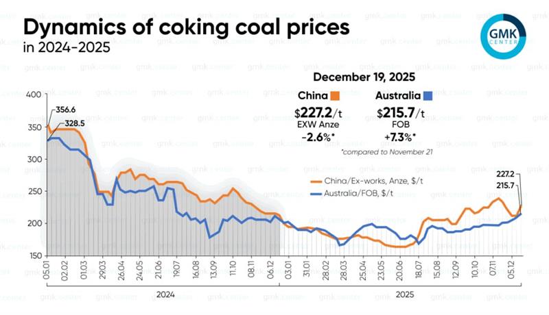 در بازار چین (Ex-works Anze)، افت قیمتها شدیدتر بود و میانگین سالانه قیمت زغالسنگ ککشو با کاهش ۲۶/۹ درصدی به ۱۹۴/۵ دلار در هر تن رسید، در حالیکه این رقم در سال ۲۰۲۴ حدود ۲۶۶ دلار بود. با این حال، تا ۱۹ دسامبر قیمتها به ۲۲۷/۲ دلار افزایش یافت که نسبت به دسامبر سال قبل ۷ درصد رشد داشت، اما نسبت به ماه قبل ۲/۶ درصد کاهش نشان میدهد.