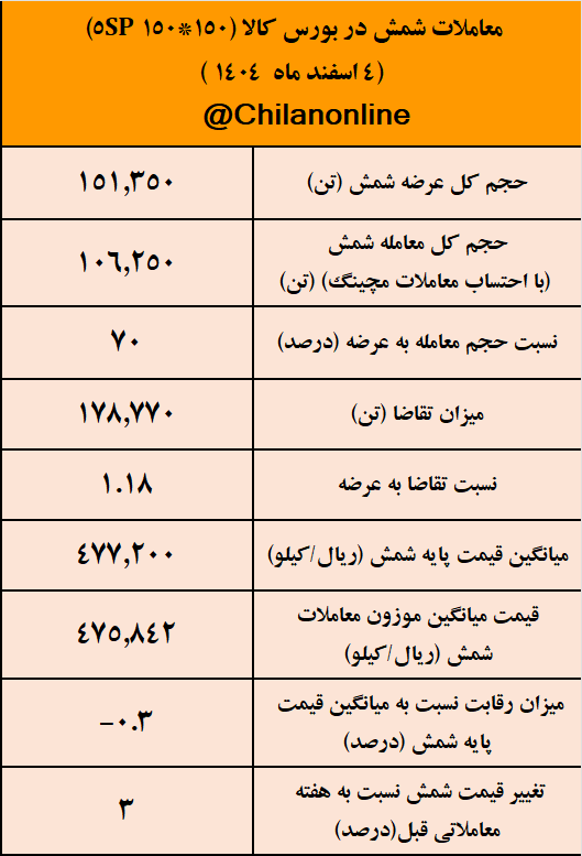 در معاملات ۴ اسفند بورس کالای ایران، بیش از ۱۵۱ هزار تن شمش بلوم 5sp عرضه شد که با تقاضای ۱.۱۸ برابری، ۷۰ درصد آن معامله شد. بیشترین حجم عرضه به نام فولاد خوزستان ثبت شد و بالاترین قیمت نیز به شرکت معدنی و صنعتی چادرملو تعلق گرفت. قیمت میانگین شمش هم با رشد ۳ درصدی به ۴۷۵۷۴ تومان رسید.