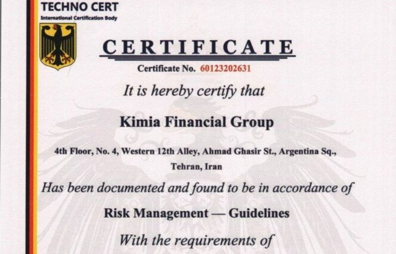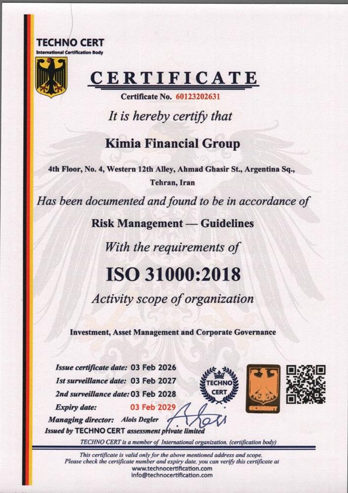 در همین راستا، گروه مالی کیمیا مس ایرانیان با هدف استقرار و اجرای نظام یکپارچه مدیریت ریسک در سطح سازمان، تحت فرآیند ممیزی تخصصی قرار گرفت و با احراز الزامات این استاندارد، موفق به دریافت گواهینامه ایزو ۳۱۰۰۰ شد. این دستاورد بیانگر رویکرد نظاممند شرکت در مدیریت ریسکهای راهبردی، عملیاتی و مالی و ارتقای شفافیت و حکمرانی شرکتی است.